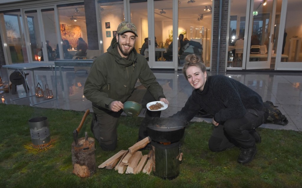 “Landgoed ‘Het Buitenland’, waarop de galerie is gevestigd, biedt een serene aanblik. De schemering heeft ingezet, een knapperend haardvuurtje staat aan en wat kaarsen lichten Joop Cornelis en Tyrell Kuipers bij. Zij bereiden in een rookoventje outdoor gerechten, zoals een stoofpotje, saté, gerookte zalm, beenham en gegrilde groenten.